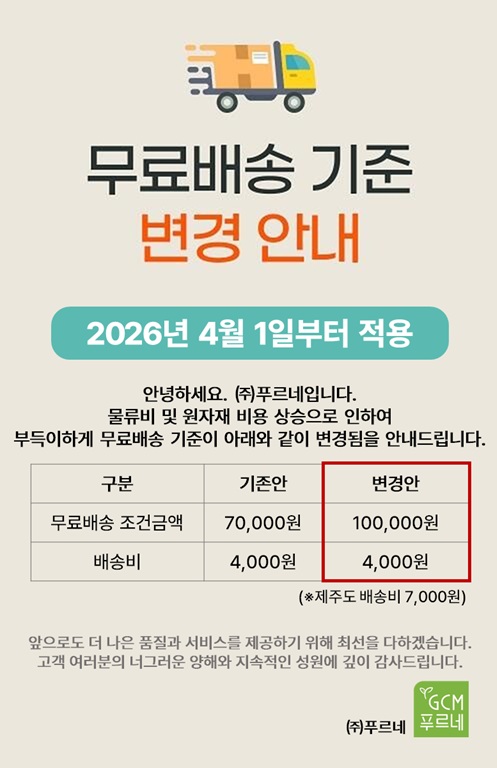 물류비 및 원자재 비용 상승으로 인하여 부득이하게 무료배송 기준이 아래와 같이 변경됨을 안내드립니다. 고객 여러분의 너그러운 양해부탁드리며, 앞으로도 더 나은 품질과 서비스를 제공하기 위해 최선을 다하겠습니다. 감사합니다.😊